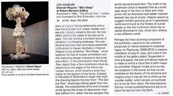 Every society accumulates contradictions amidst their ideals. Dietrich Wegner employs those contradictions, situating opposites together in sculpture and photography that feed on the friction between two conflicting ideas. When an image stands in limbo, between associations, it occupies a flexible place in our mind. Wegner creates images that are safe and unsettling, abject and beautiful. Some of his work shows us how a mushroom cloud can resemble a tree house, an anus a vortex, a suicide bomber a vulnerable human being, all in an effort to explore our varied states of contentment and security. In other works, such as in Cumulous Brand, babies are covered in multicolored tattoos in a meditation on how our identities evolve and how we declare them.