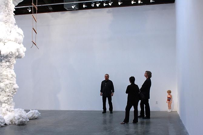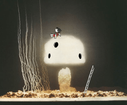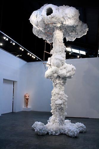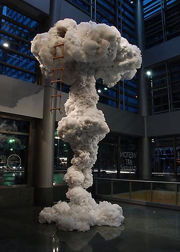 Often Wegner chooses materials that contradict an aspect of an image while striving towards a realistic depiction of the image. A mushroom cloud is fluffy like synthetic cotton, yet a Poly-fil mushroom cloud becomes fun and cozy. A blood splat (such as in Red Field) is shiny and exciting, yet perhaps signifying something not so fun. Both a Poly-fil playhouse and a urethane blood splat are examples of material reflecting what an image looks like and contradicting the tone of what a subject feels like or “means”. Sometimes the material choice does not both challenge and support an image; the material may simply do one or the other. In these cases, when the material does little contradicting, the image(s) itself must create the limbo.