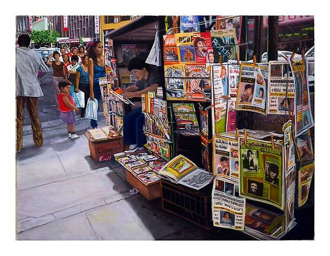 JOHN VALADEZ, a realist painter and muralist who takes as his subject the urban landscape and people of Los Angeles, was born, raised, and continues to live in L.A. His style might be compared to that of photorealists, such as Richard Estes, who gained prominence in the 1970s. However, his work is not a purely documentary reflection of mainstream society.