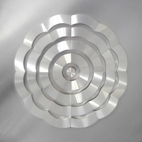 When machining aluminum, light, reflected from its etched surfaces causes movement and color changes. This phenomenon became a new form in the creating of my work.The aesthetics of precision became part of my art. I looked for a pure image that is derived from modern materials. To me, machined aluminum reflects the spirit of our times, the computer, the automated product, and the poetry of space. I try to capture that one fleeting image of a memory, a thought, and fuse it into a lasting reality of sculpture.