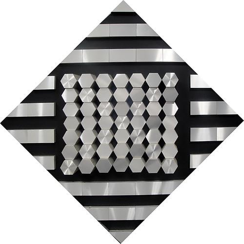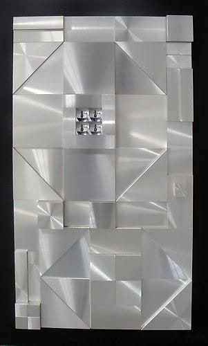 I use modules in common with industry: triangles, squares, rectangles, hexagons and circles. Machined textures and consequent development of unitized images in metal or painted wood, gives me an infinite number of combinations in the designs of my work.