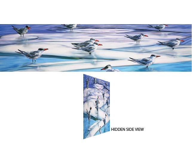 Robert Sean Coons' new work is about dichotomies. However, you would never realize that just by glancing at this body of work. Please don't be fooled by the simplicity of these paintings, there's a secret hidden within them. Each painting blends a beautiful sky or watery landscape in the background with overlaying objects from nature or man's own design. The foreground images appear very simple, but actually they are metaphors. These images act as a distraction, hence the title of the exhibition "Distractions".
