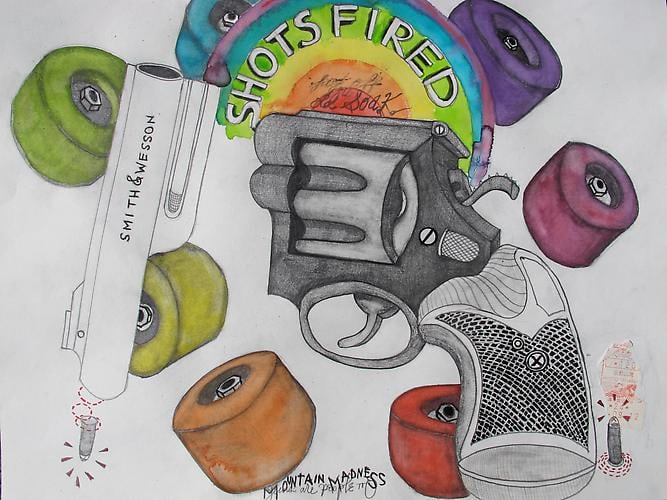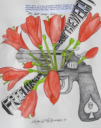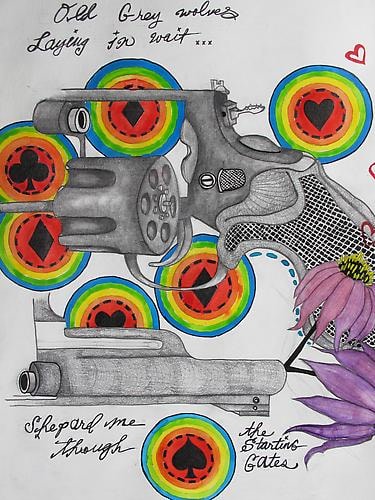 "You can get much farther with a kind word and a gun than with a kind word alone " --- Al Capone A photography exhibition at the Tate Modern in London several years had the incomprehensible , for that exhibition , name , Cruel and Tender . Strangely , that title now seems entirely fitting for the seductive yet disconcerting new drawings emanating from the creative mind of Christina Hale . These works display Ms Hale's singular drawing virtuosity , so different from the usual vacuous conceptualism that wanly passes for significance in the art world today . Mixing monochromatic line with almost psychedelic color ...... the cold steel of her revolvers mixed with bright flowers combine these stunning visual contradictions into a Pop Art meets Scar face sensibility . Ms Hale is an artist of her generation in the simplified street sensibility of her raw expressionistic renderings . These drawings , however , are not mere reflections of what Hale sees in her world today but what she feels and remembers from her past . They are the drawn from the recollection of personal tragedy within her family history . Christina Hale utilizes her considerable talent to distill and exorcise those troubling memories into these remarkably beautiful yet disquieting drawings.