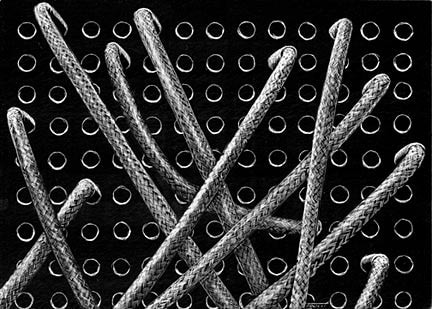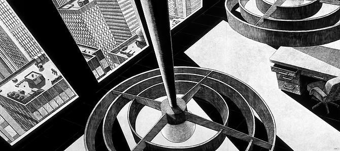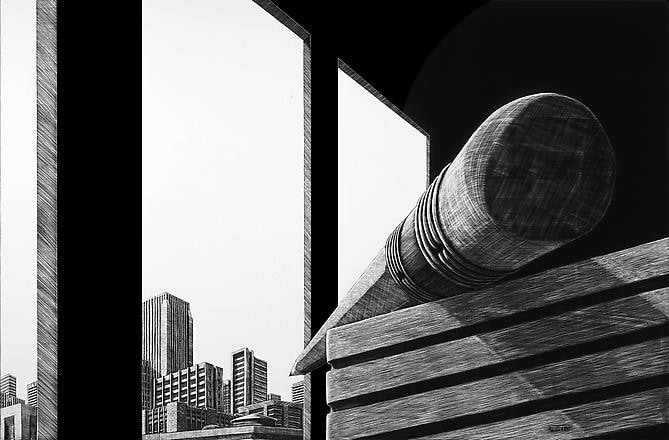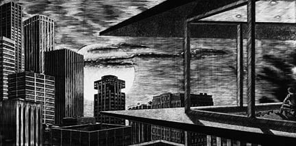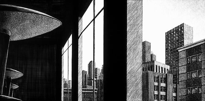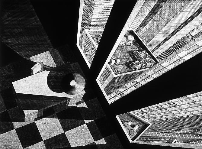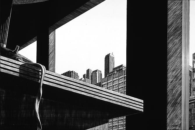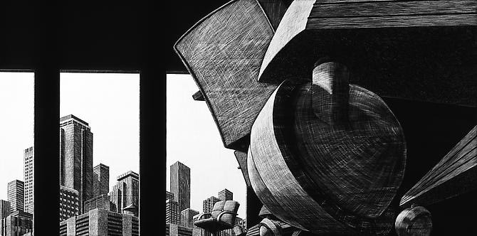 Besides his open-mindedness he has a lot going for him. He has pitch-perfect but guileless draftsmanship, infinitive reserves of patience and discipline in his mark-making, and a classic, glamorous dexterity with the properties of light. He favors images in which lone figures consider their isolation in the world. He loves the grandeur and ambition of urban architecture and imbues every inch of it with meaning. His work can withstand art historical scrutiny but he takes a promethean pride in its accessibility to broad audiences. Fans of Mondrian’s electric rectangle boogies, Malevich’s plain, meditative flat shapes, Charles Burns’s melodramatic compositions and perspectives and Escher’s mathematical psychedelia will have just as many ways into the work as fans of Ed Wood’s iconoclastic humor and Fritz Lang’s industrial miasma. Everyone always wants to know how he does it, and the truth is there are major clues about the meaning of his art inherent in his technical choices, being the direct outgrowth of how he sees the world around him.