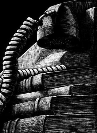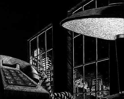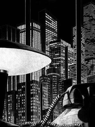 “Since the invention of the telephone we have become more and more inter-connected” says Trulli, “somehow, though, we still manage to find our own separate places, real or imagined.”David Trulli works in scratchboard: a white clay-coated board, covered with black ink. Fine knives are used to delicately scrape the ink away, creating the image.