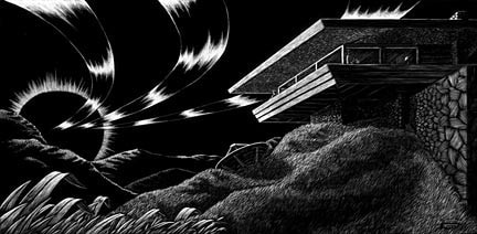 A former cinematographer, Trulli compares working in scratchboard to lighting a film set: “it starts out black and you add light.” David Trulli was born in New York and came to Los Angeles in 1979.
