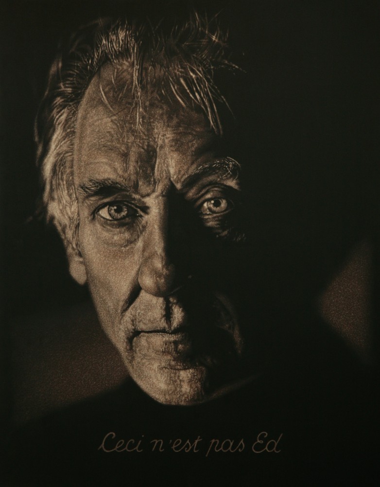 “The method of creating my paintings is subtractive. A paint brush is never used. The surface layer of dark paint is removed with sandpaper to reveal varying degrees of the white gesso surface underneath as opposed to the more traditional method of applying paint to a gessoed surface. The technique is slow and precise. The process of minutely abrading and distressing the two-dimensional surface to ‘sculpt’ the images becomes an obsessive meditation.