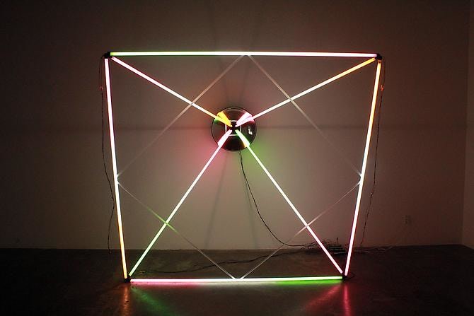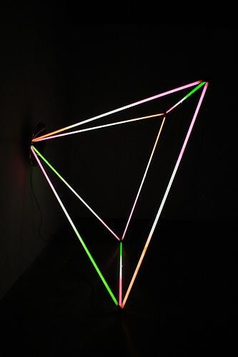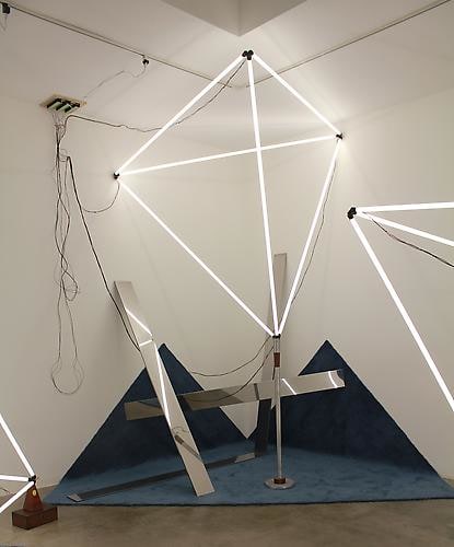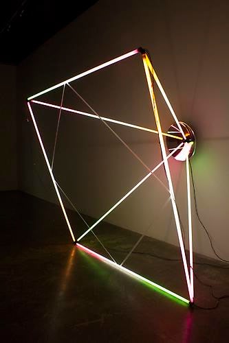 “The minimal elegance of Peters’ work is at once seductive and deceptive. Drawn into his world by dramatic effects, graceful shapes, and exuberant colors, we are left in a funhouse wonderland of visual mysteries. Momentarily lulled into a sense of comfort by the familiar materials he uses to make his work – found objects, like plastic buckets and cheap chairs, fluorescent and rope lights – the initial emotional response slowly gives way to a realization that there is much more at stake than mere effect. Peters offers us the opportunity to question the very basis of our existence and the laws that govern the functioning of our world, while celebrating its wonder and beauty.”