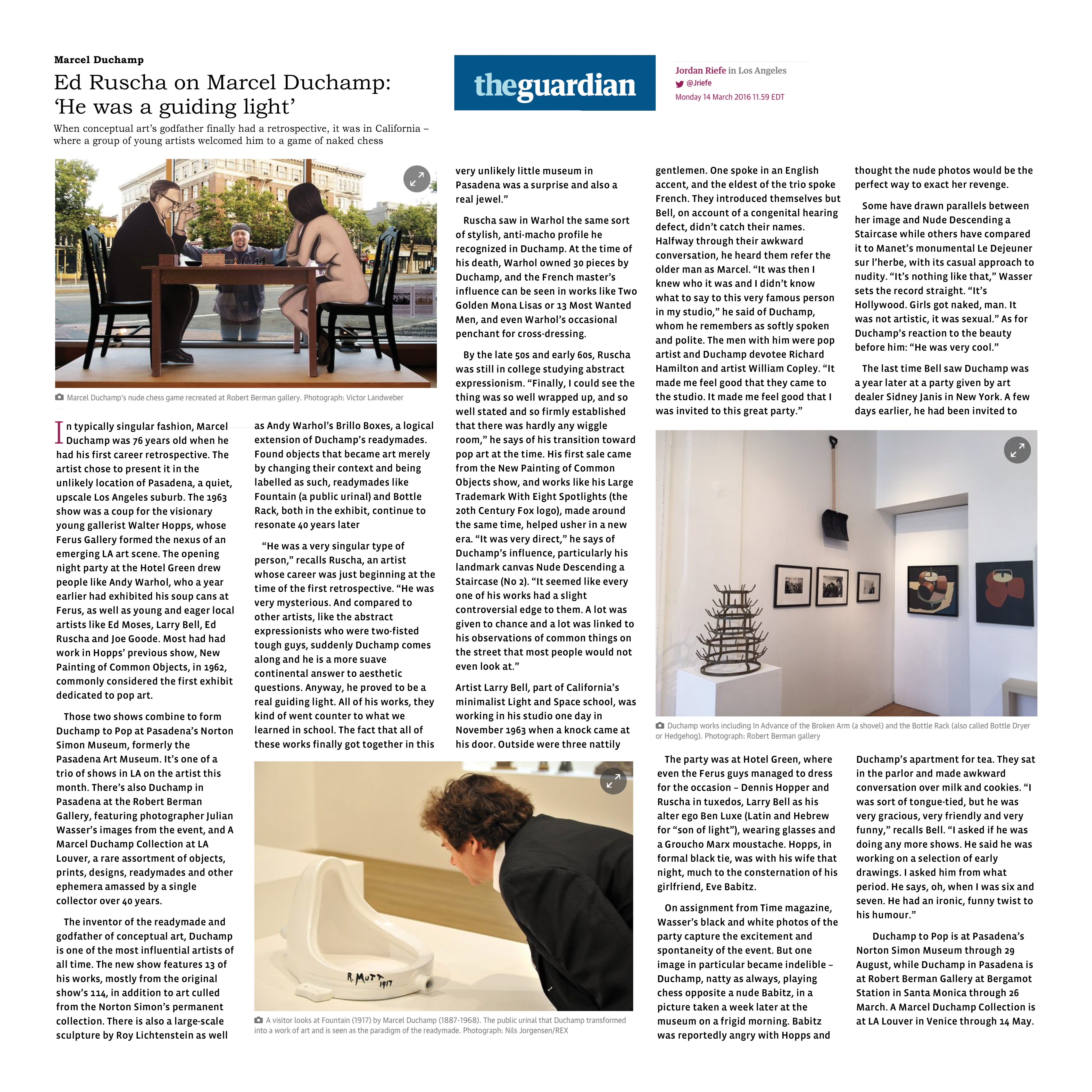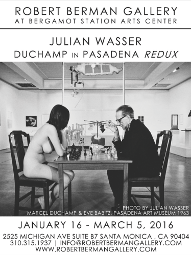 ROBERT BERMAN GALLERY in conjunction with Craig Krull Gallery is pleased to announce Julian Wasser : Duchamp in Pasadena Redux, January 2016. Due to the popularity of our San Francisco exhibition at our E6 Gallery of Julian Wasser : Duchamp in Pasadena Revisited, we are bringing the show to our larger Los Angeles venue. The exhibition will feature rare, never seen before, vintage and rare photographs documenting one of the most significant moments in California's art history. These will be on view alongside appropriations of many of the readymades and conceptual works of art by Marcel Duchamp displayed in the Pasadena Art Museum during the artist's first major U.S. retrospective in 1963. Featured appropriations are by Los Angeles based artist Gregg Gibbs and others. A vernissage will be held Saturday January 16th 5-8pm.