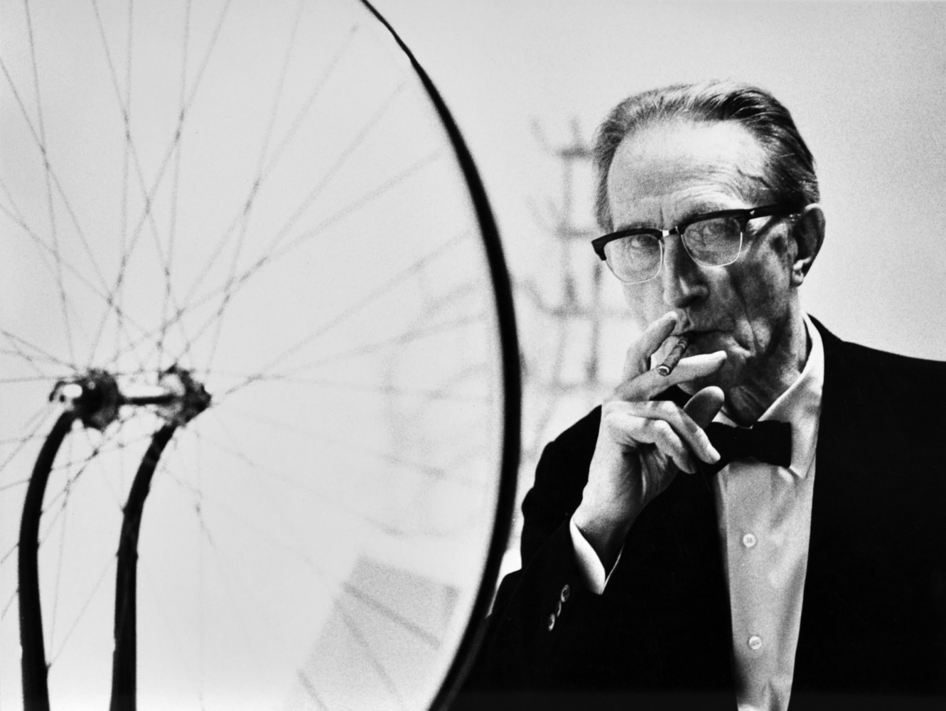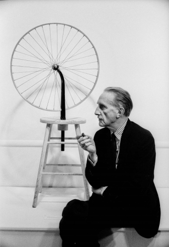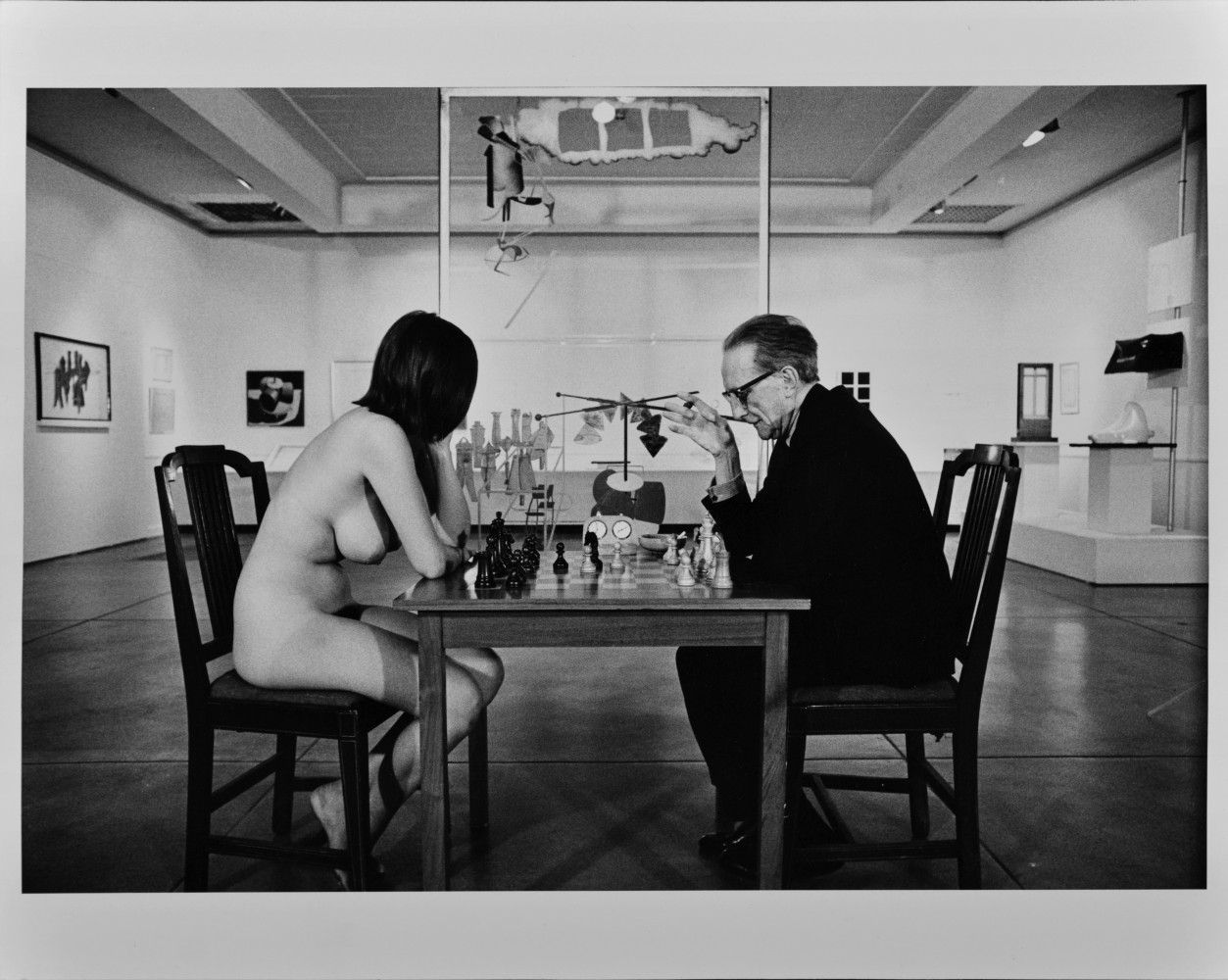Artists and luminaries including Ed Ruscha, Billy Al Bengston, Larry Bell, Dennis Hopper and a very boyish Andy Warhol flocked to the opening gala of Duchamp’s retrospective and TIME Magazine sent L.A. based photographer, Julian Wasser to cover the event. At the time, Wasser, who began his career as a teenager shooting crime scenes in Washington D.C., was unaware of Duchamp’s significance in the pantheon of art. But known for being in the right place at the right time and catching formative moments in L.A. history with an unmistakable eye, Wasser not only captured the energy of Duchamp’s opening reception, but produced several of the most iconic pictures of the artist ever made. Duchamp posing next to his groundbreaking readymade Bicycle Wheel, originally conceived in 1913 and Duchamp playing chess with a nude Eve Babitz were among the images Wasser took while on assignment. Though TIME never published Wasser’s pictures, the latter photograph, inspired by one of Duchamp’s master paintings Nude Descending a Staircase and the artist’s obsession with chess, went on to become one of the most recognizable staged photographs of the 20th Century.
