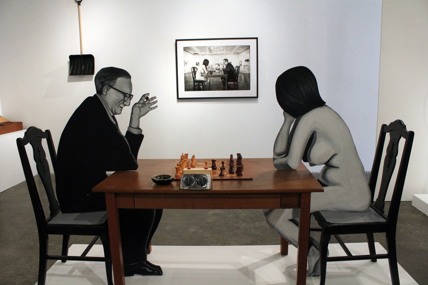 Julian Wasser : Duchamp in Pasadena Revisited brings the quintessential photographs of Julian Wasser, together with an installation of appropriated works of art produced primarily by L.A. based artist Gregg Gibbs to create an exclusive experience of the 1963 Duchamp retrospective at the Pasadena Art Museum. Works on view originally produced by Duchamp and appropriated by Gibbs will include early works such as Bicycle Wheel, Nude Descending a Staircase, I.H.O.O.Q, 1919; With Hidden Noise, 1916, and one of Duchamp’s masterworks (The Large Glass) The Bride Stripped Bare of Her Bachelors, Even 1915-1923. The piece de resistance is a life-sized recreation of Wasser’s now-infamous photograph of Marcel Duchamp and Eve Babitz playing chess at the museum in 1963.