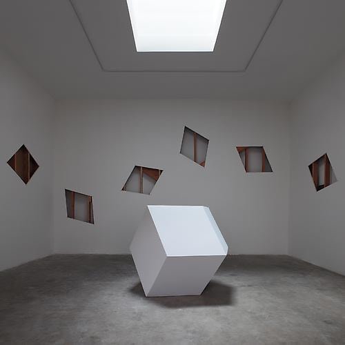 In the last room, the artist cuts out from the very walls of the gallery to create an assemblage, which then sits inside it. This, by turning part of the spacial enclosure into what is displayed, the containing once again becomes the contained.