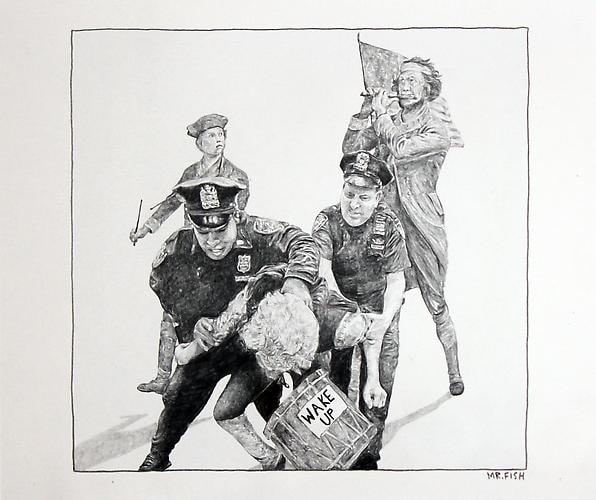 Mr. Fish has been a freelance writer and cartoonist for eighteen years, publishing under both his real name (Dwayne Booth) and the penname of Mr. Fish with many of the nation's most reputable and prestigious magazines, journals, and newspapers. In addition to his weekly cartoon for Harper's and daily contributions to Truthdig, he has also contributed to the Los Angeles Times, the Village Voice, the LA Weekly, the Atlantic, the Huffington Post, The Nation, Vanity Fair, Mother Jones, the Advocate, Z Magazine, the Utne Reader, Slate.com, MSNBC.com, and others. He has also worked for National Public Radio. In May 2008 he was presented with a first place award by the Los Angeles Press Club for editorial cartooning. In May 2010 he was awarded the prestigious Sigma Delta Chi Award for Editorial Cartooning from the Society of Professional Journalists and most recently won the Society of Professional Journalists (SPJ) Award in May of 2011. He lives in Philadelphia with his wife and twin daughters.