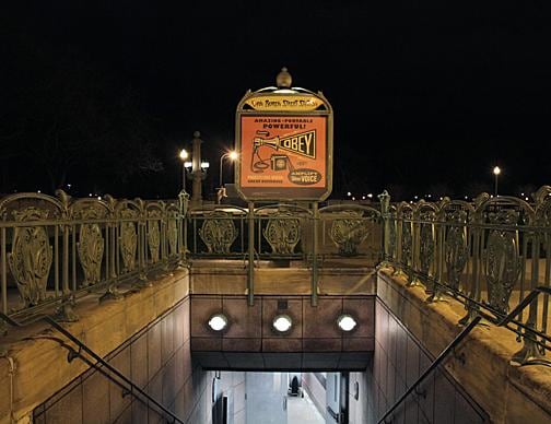 Fairey's mural will anchor the display. It is printed on standard copy paper using an oversize blueprint printer and applied to the surface of the viaduct with standard wallpaper glue, exhibition organizers said.