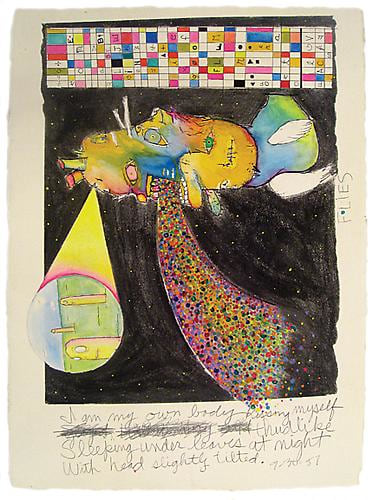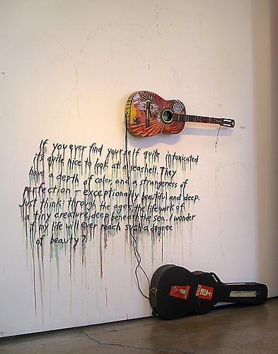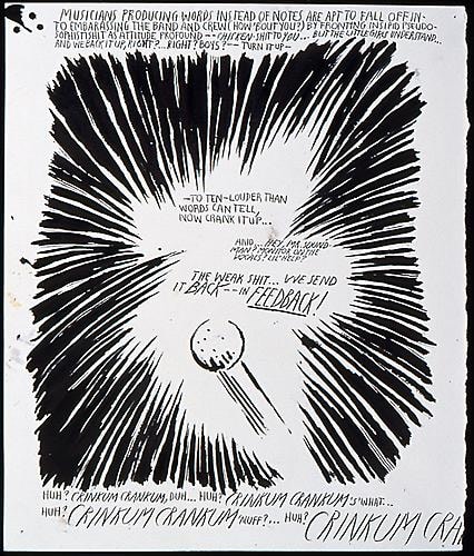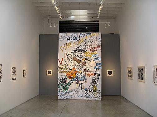 On exhibit are paintings, drawings, collages, hand-painted installation by Lee Ranaldo, a grand-scale wall mural by Raymond Pettibon and vitrines of vintage ephemerea and lyric sheets by Pettibon and Daniel Johnston/ Also a large collection or rare and early Daniel Johnston works, many of which have never been publicly exhibited, are also on view from the collection of Don Goede, co-author along with Tarssa Yazdan of the definitive book on the artist “Hi, How Are You?”. These works will be published in the next edition of this book as well.