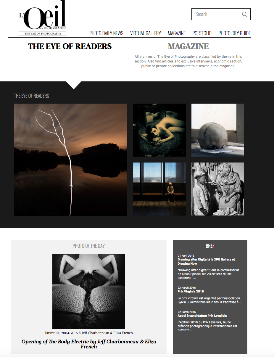Jeff Charbonneau and Eliza French have been working together since 2004 when a mutual interest in the photographic medium brought them together. Their performance-based images are created through a partnership from conception to finish, and have been exhibited in group shows and international art fairs since 2006. Charbonneau is a masterful printer working in traditional black and white darkroom technique. He attended the University of Wisconsin and UCLA for graduate studies where he studied music, anthropology and photography. He has divided his time between the motion picture and television industry and photography for twenty years. Eliza French studied screenwriting at NYUs Tisch School of the Arts and earned a degree in Art History from UCLA in 2001. In 2008 she became a full-time artist in collaboration with her partner after working for several years in the entertainment and arts industries.