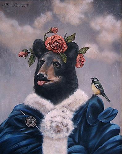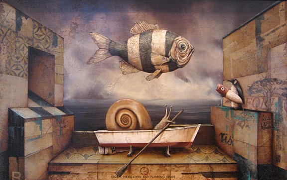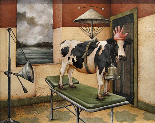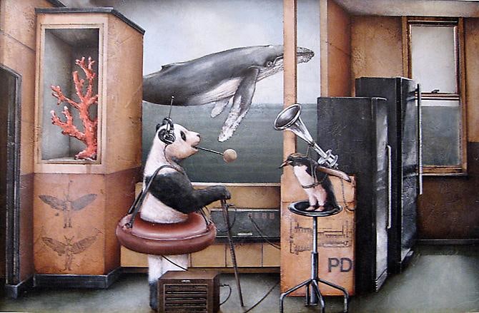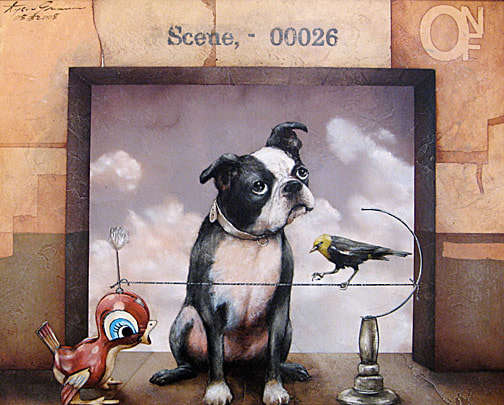 As the artist states, "The stories being told in each painting are created without preconceived planning. I add each element until I see a story. I enjoy forming the story, or parable, step-by-step with found imagery, animals interacting with humans and whatever grabs my eye. Often I keep in mind an overall theme, which in this case is parables told around the nooks, crannies, and niches of walls. This basic theme gives me focus, and a starting point, and from there, the story evolves itself. The characters, animals, and people that fall into these niches are created with a variety of intellectual range, and sometime seem to know what’s going on a lot more than you, or even me, the creator. I find this irony critical to the statements they seem to be making."