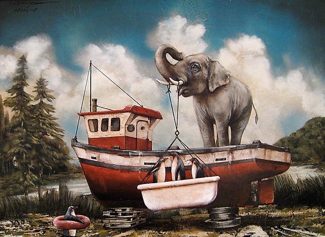 The Robert Berman Gallery is pleased to present a new collection of paintings by Tyson Grumm entitled Anthropomorphism 01. Viewing an exhibition by Tyson Grumm is momentarily entering a fantastical world of unique characters, wild animals, nostalgic objects and textural environments created entirely in the mind of the artist. These well-rendered, contemporary Surrealist works are freeze-frame glimpes of these elements humorously and mysteriously orchestratred inside de Chirico-esque landscapes and architectural surroundings. Exploring these works reveals a story that is only partially told, enabling the viewer to contribute their own unique perceptions to the completion of each of Grumm’s works.